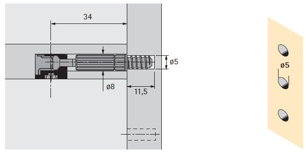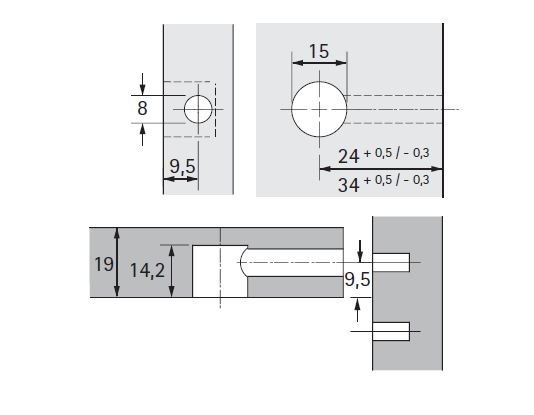 Pour les panneaux de 19 mm d'épaisseur, vous pouvez utiliser des goujons de 20.3 mm avec un fraisage à 24 mm.