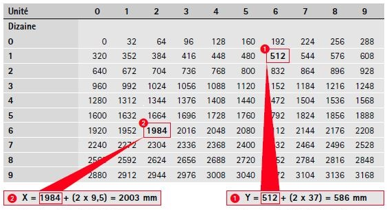 - Pour la cote Y (600 - 2 x 37) choisir 512 mm dans le tableau de correspondance.
