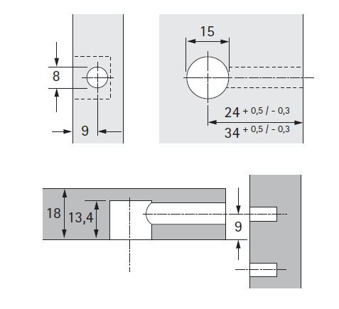 Pour les panneaux de 18 mm d'épaisseur, vous pouvez utiliser des goujons de 20.3 mm avec un fraisage à 24 mm.